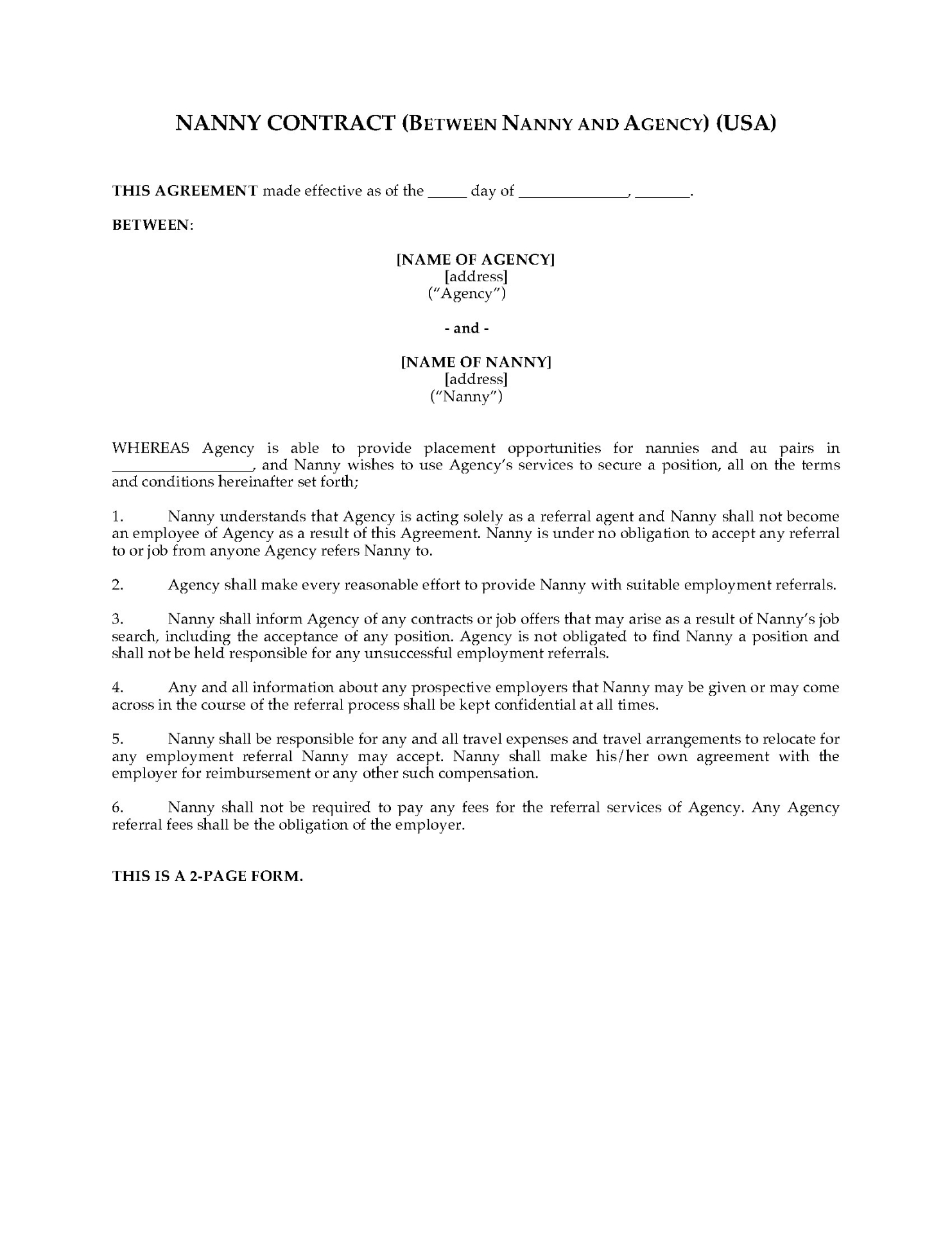 - The Nanny Placement Contract template is generic (not country-specific) and can be re-used as often as you require. Download immediately after purchase.