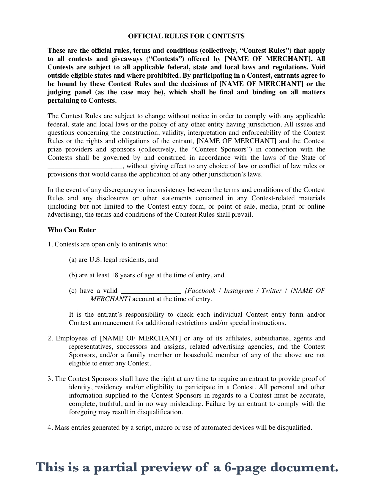 Prepare a set of rules and regulations governing how online contests will be run with this easy-to-use template for Canadian websites.