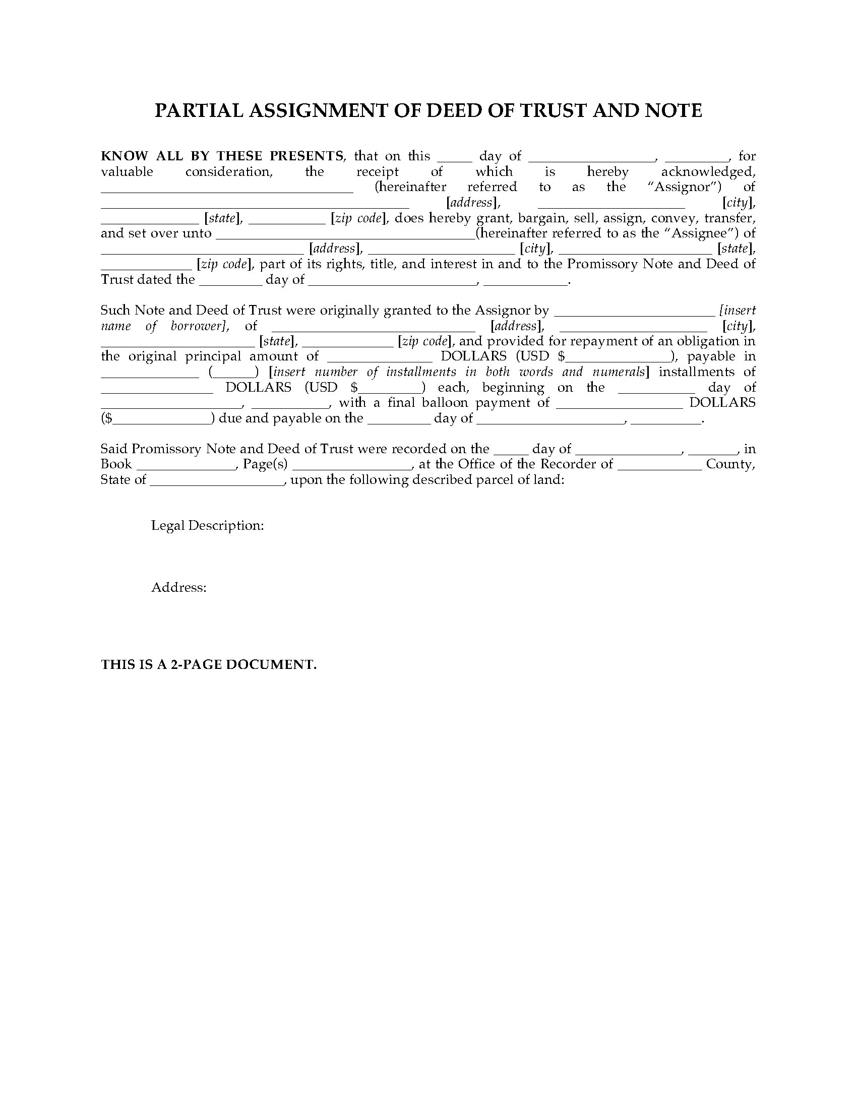 USA lenders can assign part of an interest in a Deed of Trust and the accompanying promissory note to another party with this easy-to-use Partial Assignment.