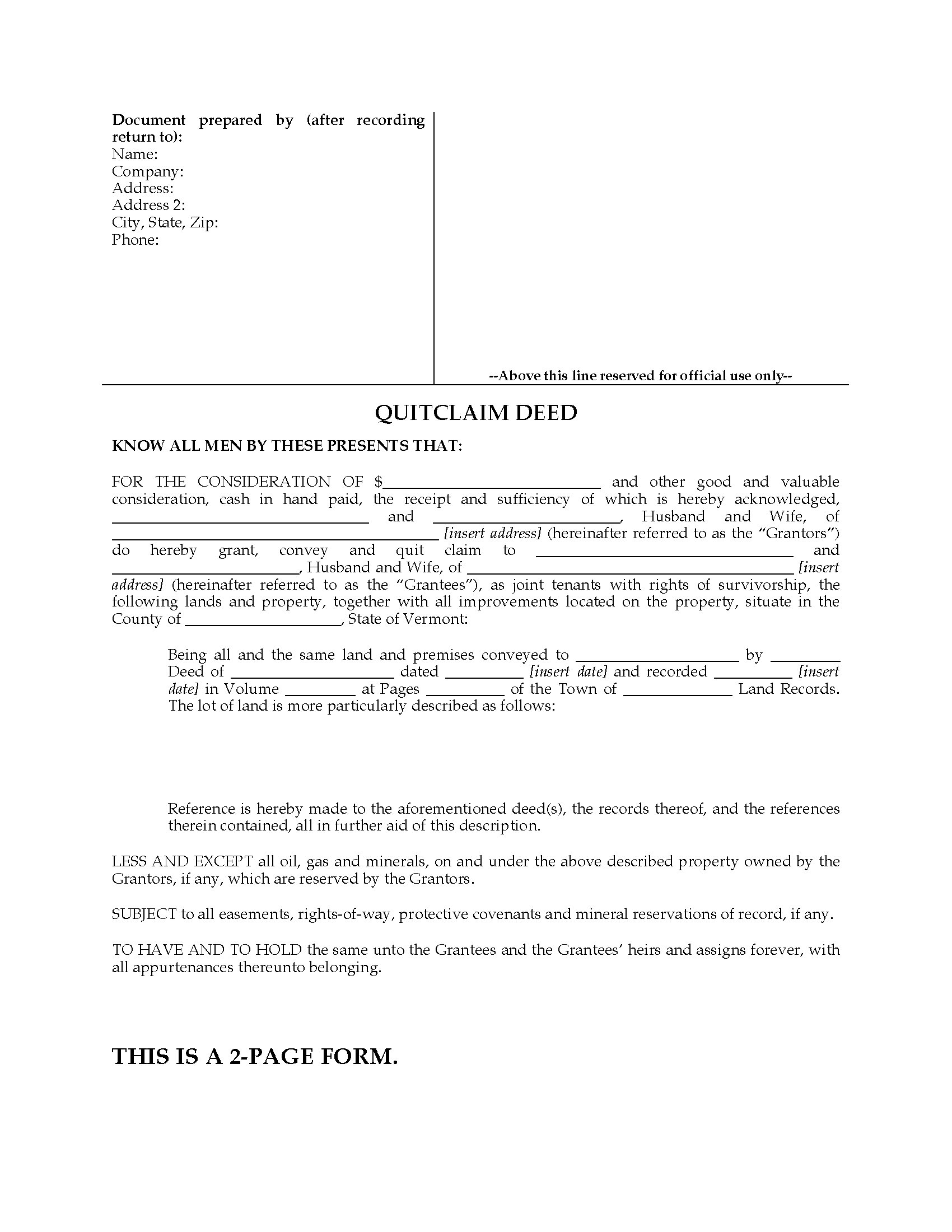 This Vermont Quitclaim Deed for Joint Ownership form is provided in MS Word format and is easy to download, fill in and print.