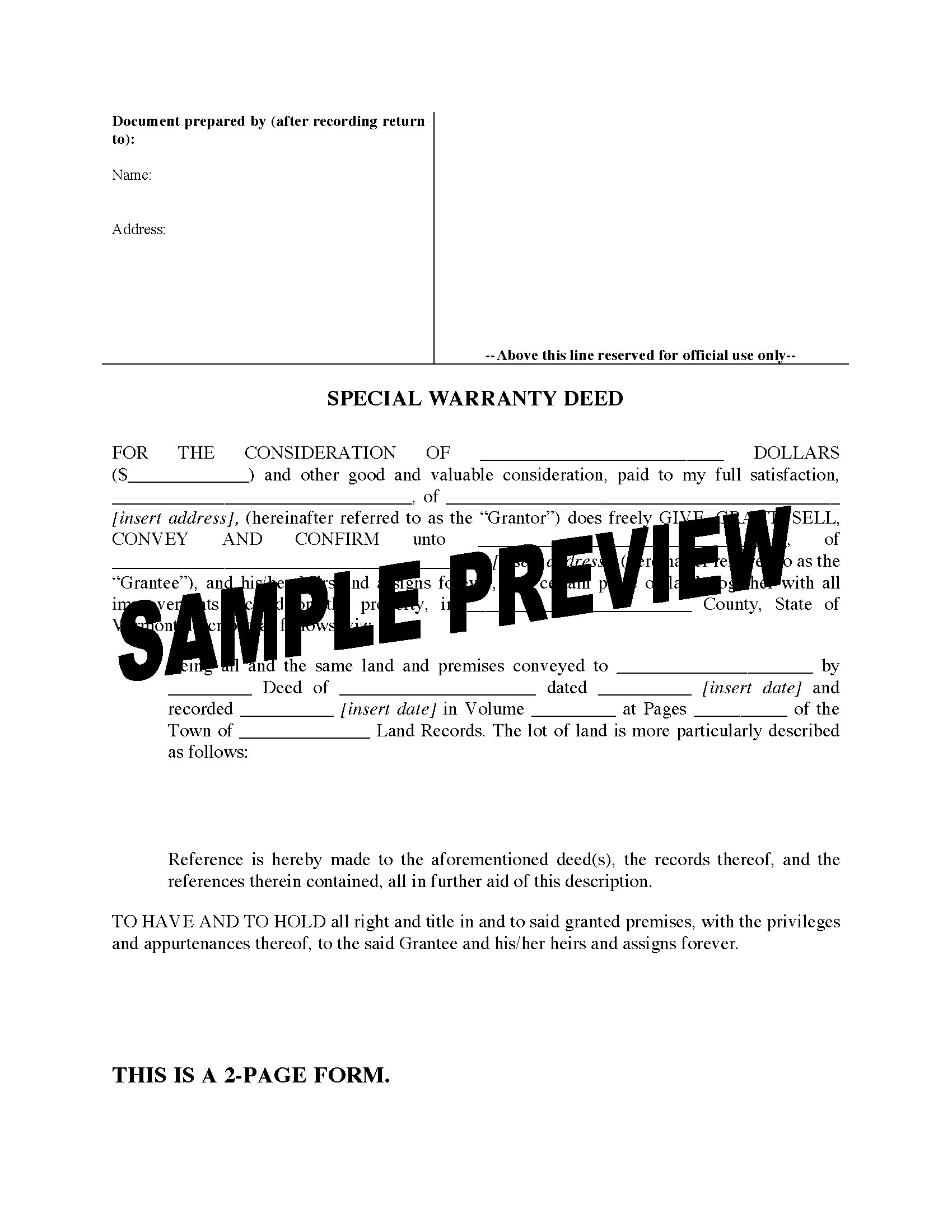 Vermont Special Warranty Deed