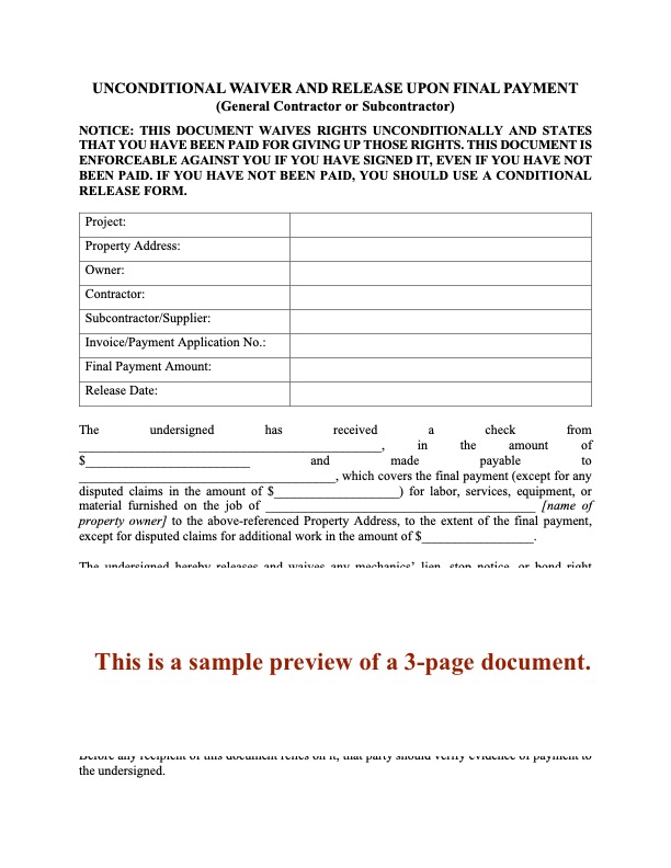 - The Waiver and Release authorizes a full and complete release of any lien rights or claims for payment which the contractor may have against the owner's property.