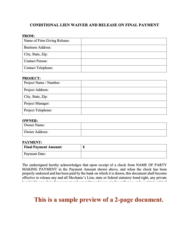 This Conditional Lien Waiver and Release on Progress Payment is available as a downloadable MS Word document. It is fully editable and reusable, making it convenient and cost-effective for use on all your projects.