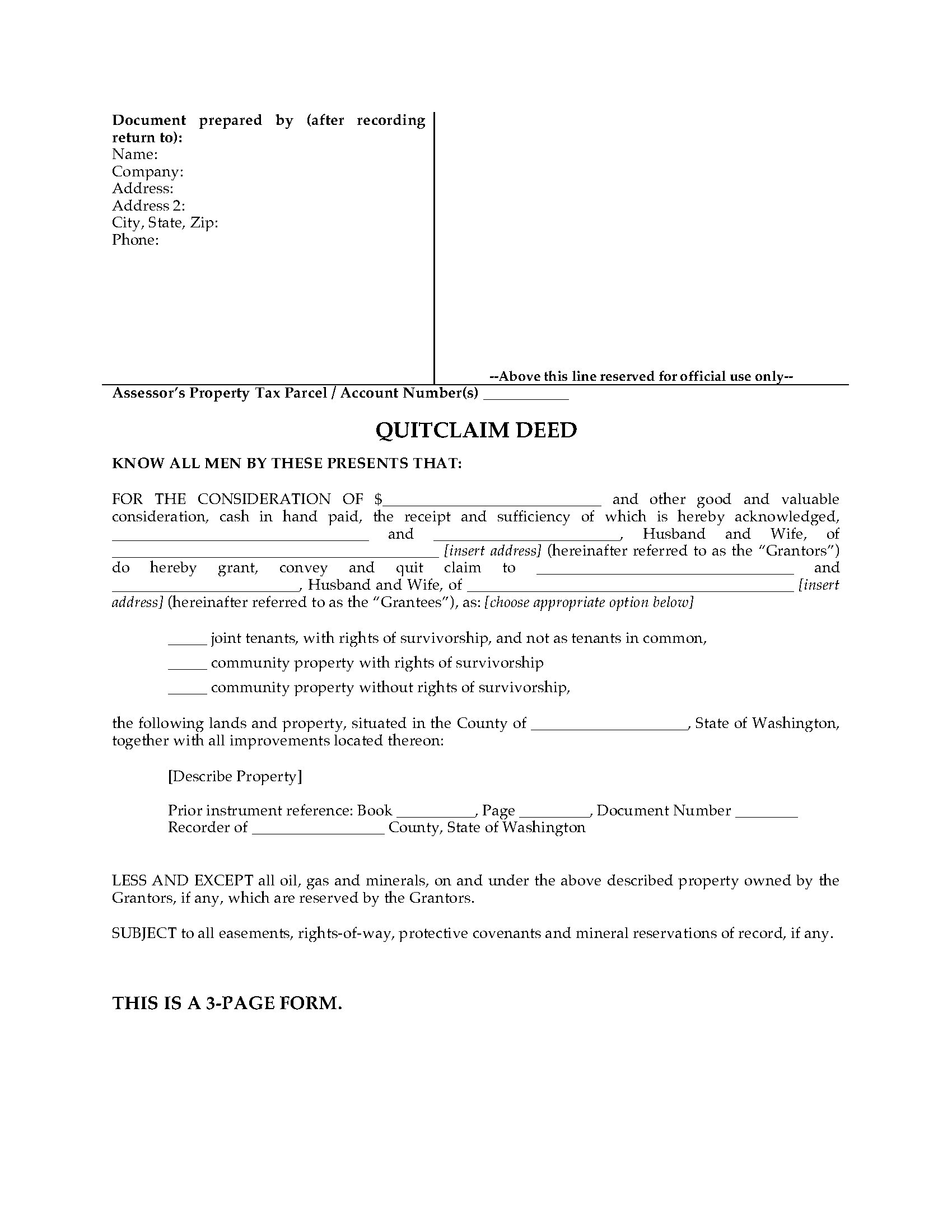 Washington Quitclaim Deed for Joint Ownership form is provided in MS Word format and is easy to download, fill in and print.