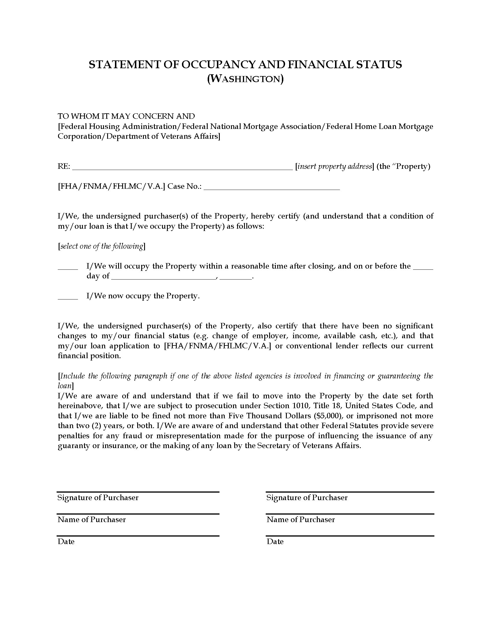 The Statement of Occupancy and Financial Status is part of the mortgage paperwork required for a home purchase loan in Washington State.