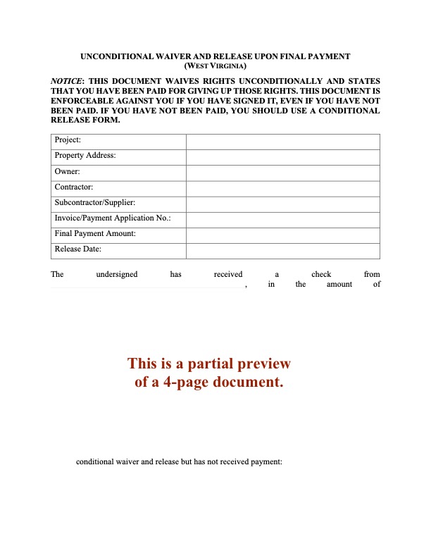 West Virginia Lien Waiver and Release Forms Package