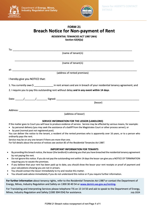 Western Australia Notice to Tenant of Breach of Agreement