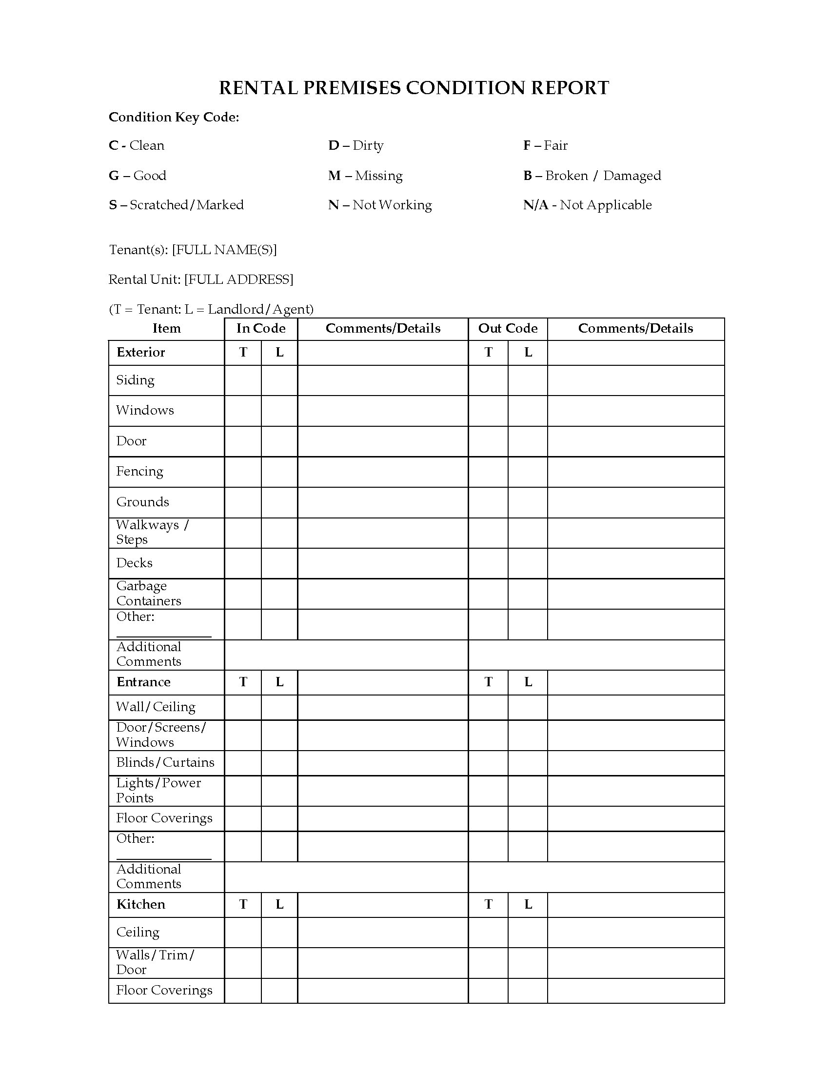 Fill in this Rental Premises Inspection Report each time a tenant moves in or out of your rental property.