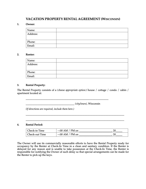 Wisconsin Vacation Property Rental Application