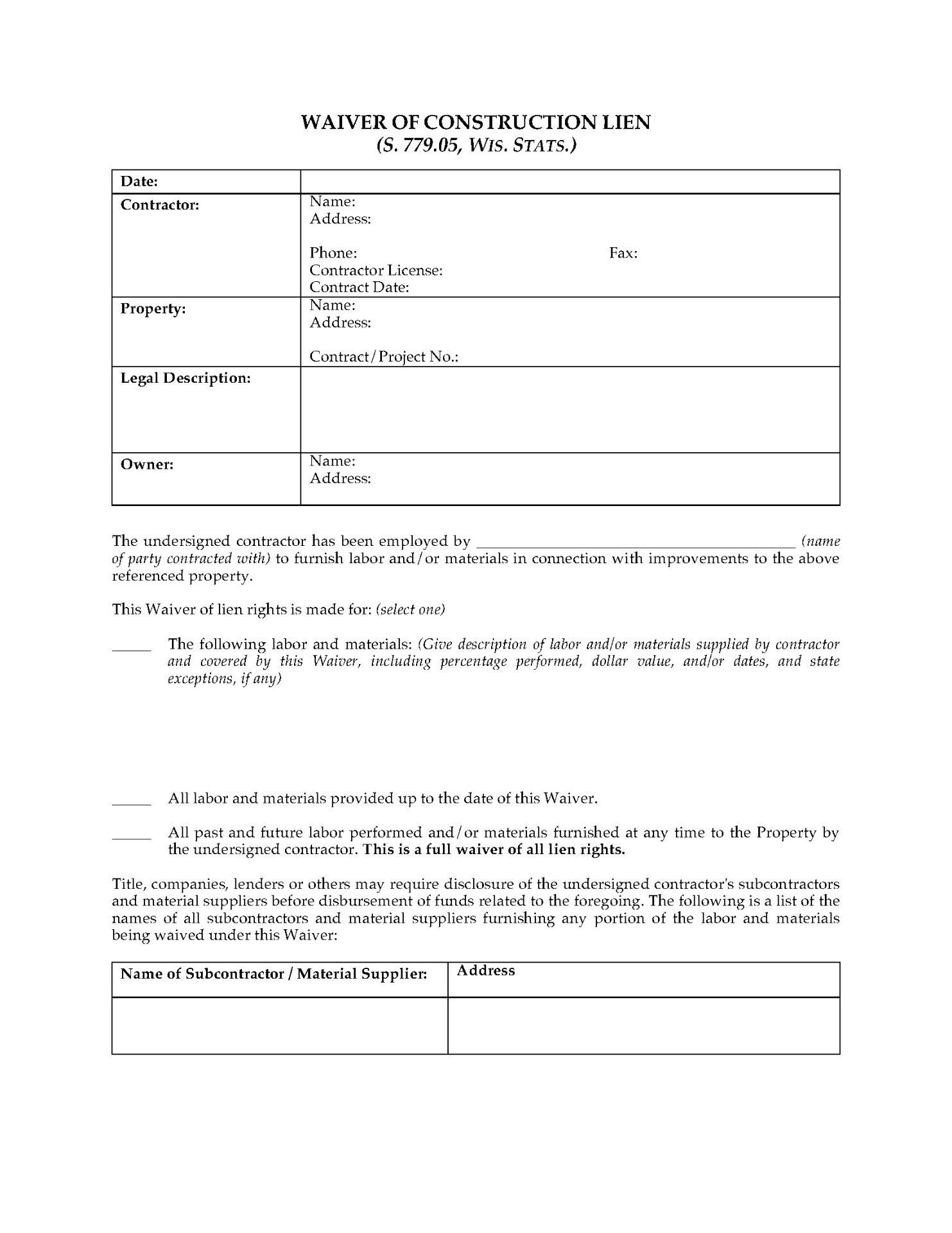 The form includes a copy of Section 779.06(2) of the Wisconsin Statutes setting out the notice requirements for filing your lien claim.